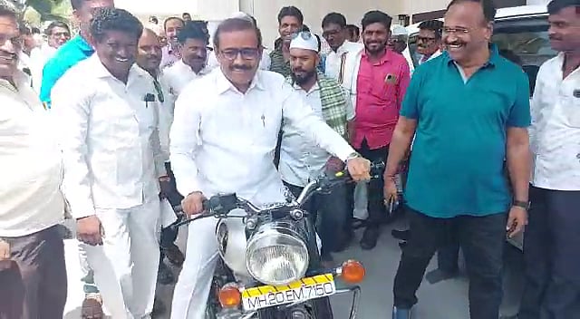 जालना येथे एका कार्यकर्त्याने आणलेल्या नव्या बुलेट चा शुभारंभ करताना आरोग्य मंत्री राजेश टोपे यांना बुलेट चालवण्याचा मोह आवरला नाही. रांजणी येथील राष्ट्रवादीचे कार्यकर्ते शेख यांनी नवीन बुलेट घेतली. मात्र, त्याचा शुभारंभ आरोग्यमंत्र्यांच्या हस्ते करायचा अशी त्यांची इच्छा होती. त्यामुळं टोपे यांच्या निवासस्थानी त्यांनी बुलेट घेऊन आले.. यावेळी टोपे यांनी आपल्या घरासमोरच बुलेटवर फेरफटका मारला, यावेळी कार्यकर्त्यानी हा प्रसंग आपल्या मोबाईल मध्ये कैद केलाय.