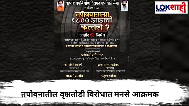 यावर आता महाराष्ट्र नवनिर्माण चित्रपट कर्मचारी सेनेकडून तपोवनातल्या १८०० झाडांची कत्तल प्रकरणी जाहीर निषेध करण्यात येणार आहे. हा निषेध नोंदविण्या साठी सर्व कलाकार सहभागी होणार असून, वृक्षप्रेमी-नाशिककर तुम्ही देखील सहभागी व्हा असे आव्हान मनसेकडून करण्यात आले आहे.