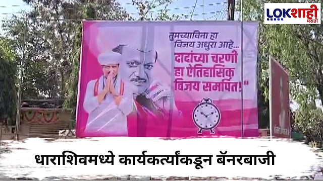 (Dharashiv) धाराशिवमध्ये कार्यकर्त्यांकडून बॅनरबाजी करण्यात आली आहे. 'तुमच्या विना विजय अधुरा, 'अजितदादांच्या चरणी विजय समर्पित' असे या बॅनरवर लिहिण्यात आल्याचे पाहायला मिळत आहे.