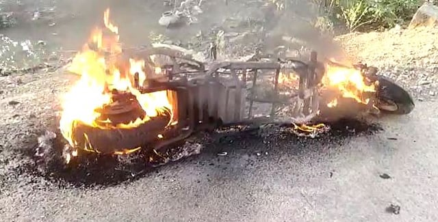 गुरुवारी सायंकाळी चार साडेचारच्या दरम्यान जुनेद मेमन बॅटरीवर चालणारी मोटर सायकल व त्या डिक्कीत सुमारे एक लाख रुपये रोकड जात होते. अचानक गाडीत स्पार्किंग झाले आणि तीने पेट घेतला. बघता बघता अवघ्या दहा मिनिटातच वाहनाची राखरांगोळी झाली.