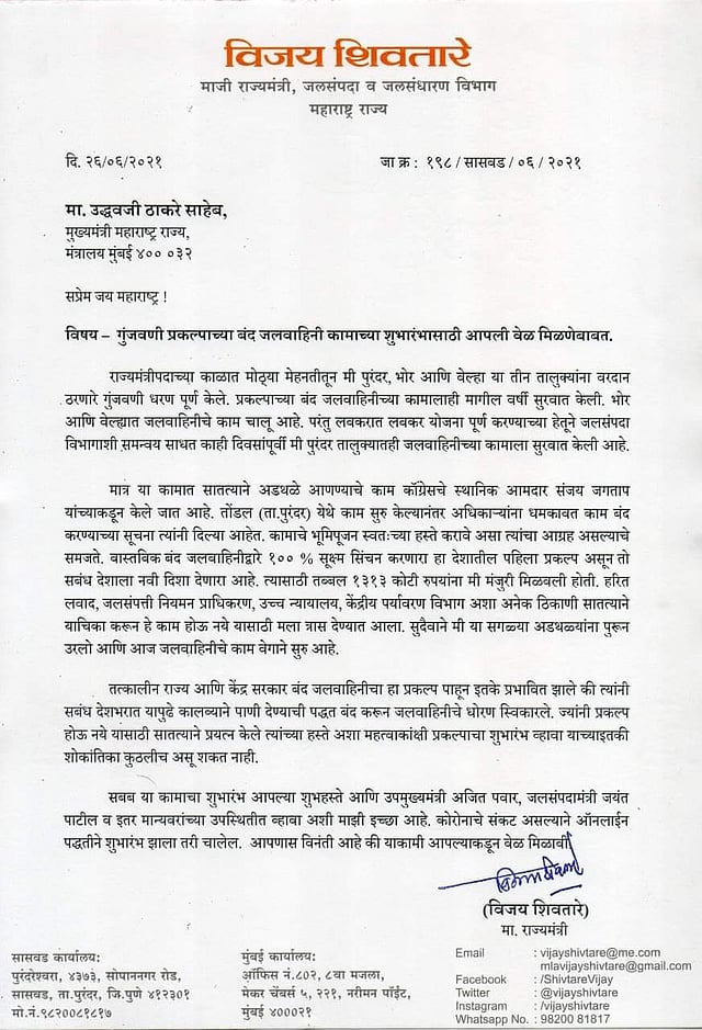शिवतारे पत्रात म्हणतात "राज्यमंत्रीपदाच्या काळात मोठ्या मेहनतीतून मी पुरंदर, भोर आणि वेल्हा या तीन तालुक्यांना वरदान ठरणारे गुंजवणी धरण पूर्ण केले. मी पुरंदर तालुक्यातही जलवाहिनीच्या कामाला सुरवात केली आहे. मात्र, या कामात सातत्याने अडथळे आणण्याचे काम कॉंग्रेसचे स्थानिक आमदार संजय जगताप यांच्याकडून केले जात आहे." याशिवाय "तोंडल येथे काम सुरु केल्यानंतर अधिकाऱ्यांना धमकावत काम बंद करण्याच्या सूचना त्यांनी दिल्या आहेत. कामाचे भूमिपूजन स्वतःच्या हस्ते करावे असा त्यांचा आग्रह असल्याचे समजते." असही माजी राज्यमंत्री विजय शिवतारे यांनी पत्रात म्हंटले आहे. यामुळे महाविकास आघाडीत किमान स्थानिक पातळीवर तरी मतभेद असल्याचं दिसत आहे.