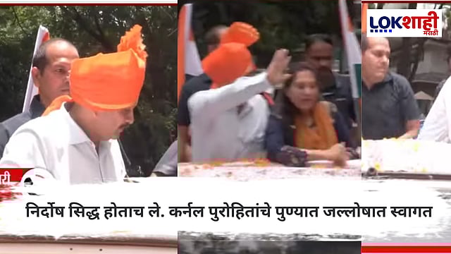 आज पुणे निवासस्थानी ले. कर्नल प्रसाद पुरोहितांचं जंगी स्वागत करण्यात आले होते. पुरोहित यांची मालेगाव बॉम्बस्फोट खटल्यातून निर्दोष मुक्तता झाल्यानंतर पुण्यातील निवासस्थानाच्या बाहेर जल्लोष पाहायला मिळाला आहे.