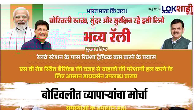 बोरिवली परिसरात इंद्रप्रस्थ ते मोक्ष प्लाझा या मार्गावर व्यापा-यांकडून कडून उद्या मोर्चाचे आयोजन ,या मोर्चाच्या बॅनरवर भाजपच्याच आमदार, खासदार आणि नगरसेवकांचे चेहरे का , मनसेच्या नयन कदमांचा सवाल उपस्थितीत करण्यात आला आहे.