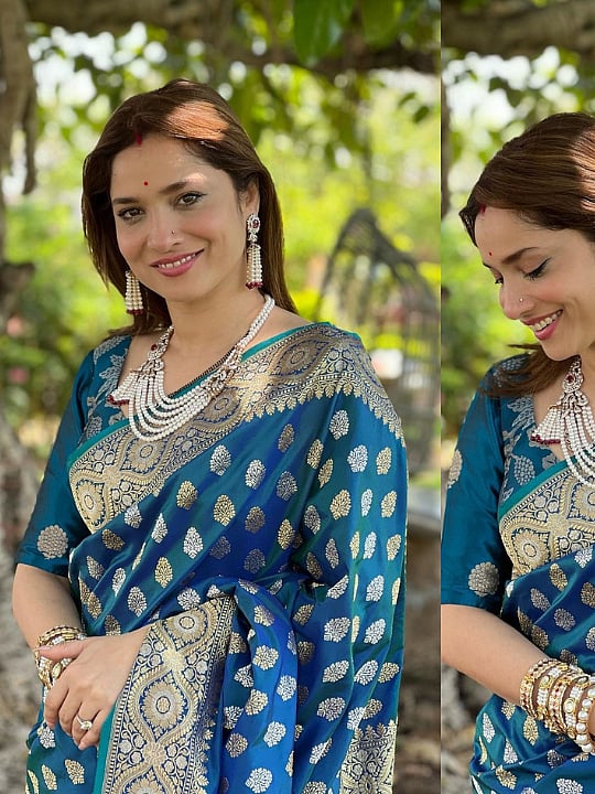 यामध्ये तिने निळी साडी घातली आहे. सोबतच मोत्यांचे दागिने कॅरी केले आहेत.
