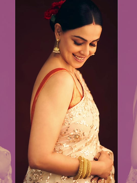 फोटोंमध्ये जेनेलियाने ऑफ व्हाइट साडी घातली असून स्लीव्हलेस ब्लाऊज घातला आहे.