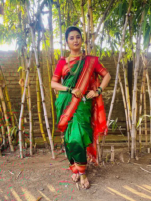यावेळी प्राजक्ता हिरव्या रंगाच्या नऊवार साडीमध्ये दिसत आहे. या लूकमध्ये प्राजक्ता खूपच सुंदर दिसते.