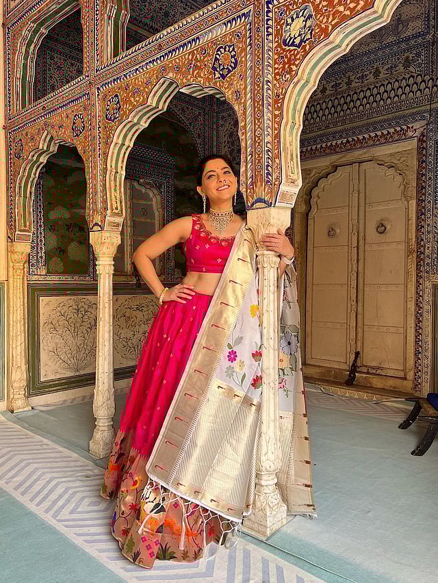 "राणी कलरच्या मराठमोळ्या लैहंगा चोली मध्ये #pinkcity #jaipur मधल्या लग्नसोहळ्यासाठी सज्ज" असे कॅप्शन फोटोजनां तिने दिले आहे.
