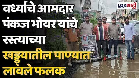 वर्ध्याचे आमदार पंकज भोयर यांचे रस्त्याच्या खड्ड्यातील पाण्यात लावले फलक
